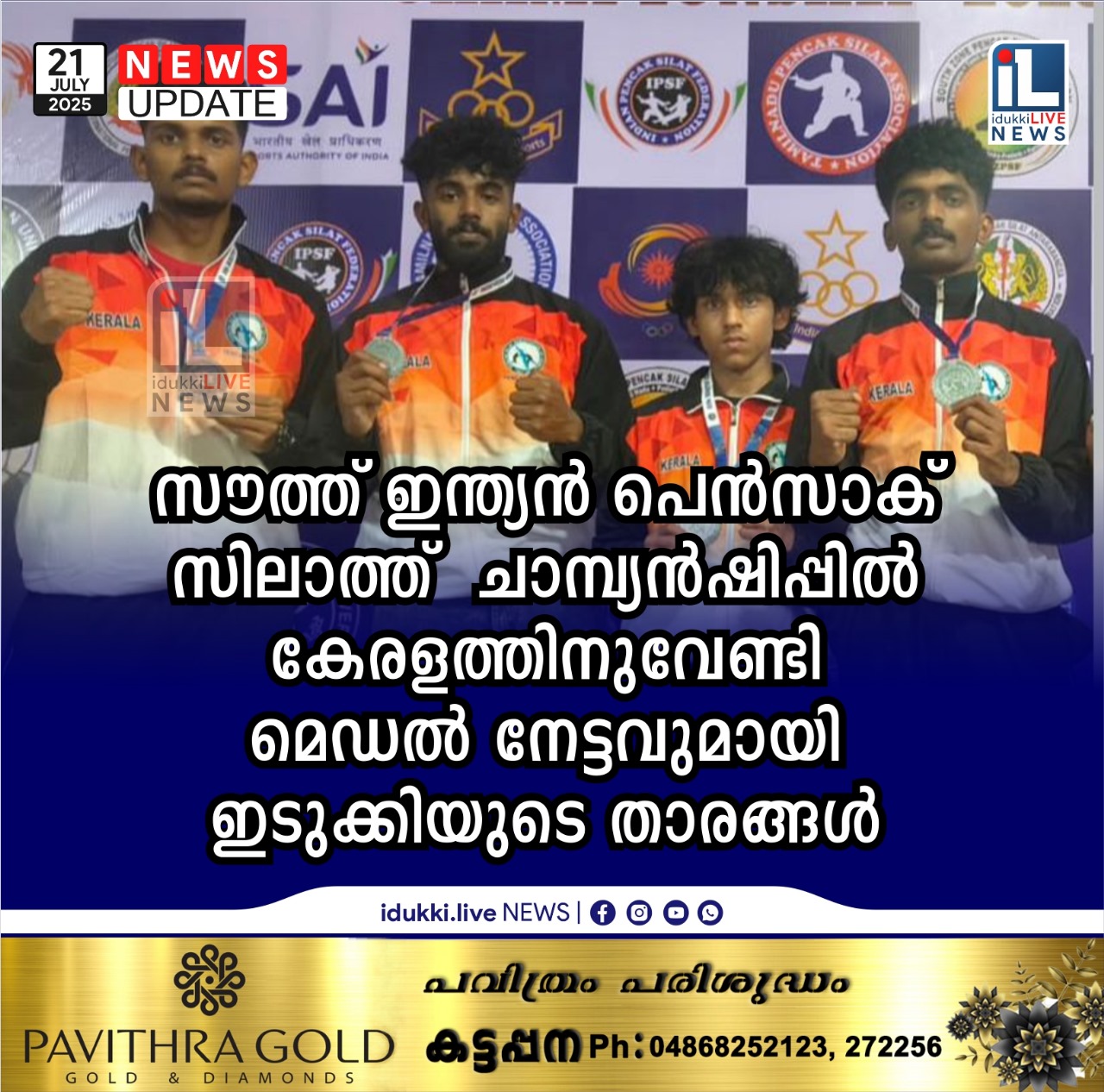 തമിഴ്നാട് തിരുച്ചിറപള്ളി കൊങ്ങുനാഡ് കോളേജ് ഓഫ് എഞ്ചിനിയറിങ്ങ് ടെക്നോളജി ഇൻഡോർ സ്റ്റേഡിയത്തിൽ വെച്ച് നടന്ന 6-മത് സൗത്ത് ഇന്ത്യൻ പെൻസാക് സിലാത്ത് ചാമ്പ്യൻഷിപ്പിൽ കേരളത്തിനായി മെഡൽ നേട്ടവുമായി ഇടുക്കി സ്വദേശികൾ മൂന്ന് വെള്ളി ,ഒരു വെങ്കലം അടക്കം നാല് മെഡലുകളാണ് ഇവർ കേരളത്തിനായി നേടിയത്.ജൂലൈ 19,20 തീയതികളിലായി തിരുച്ചിറപള്ളി കൊങ്ങുനാഡ് കോളേജ് ഓഫ് എഞ്ചിനിയറിങ്ങ് ടെക്നോളജി ഇൻഡോർ സ്റ്റേഡിയത്തിൽ നടന്ന മത്സരത്തിൽ .സീനിയർ വിഭാഗത്തിൽ