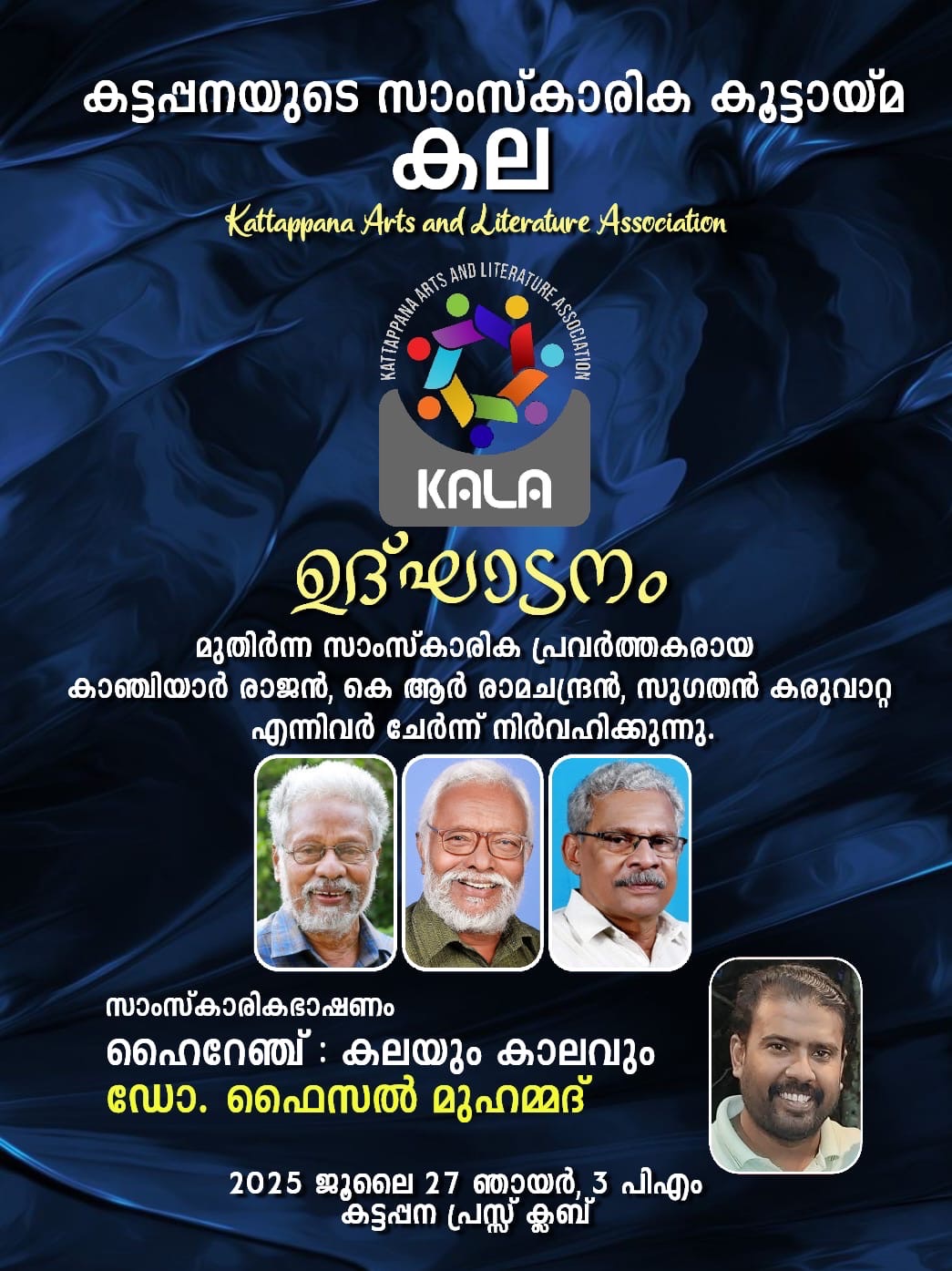 കട്ടപ്പനയുടെ സാംസ്കാരിക കൂട്ടായ്മയായ “കല ” യുടെ ഉദ്ഘാടനം ജൂലൈ 27 ഉച്ചകഴിഞ്ഞ് 3ന് കട്ടപ്പന പ്രസ്ക്ലബ് ഹാളിൽ നടക്കും