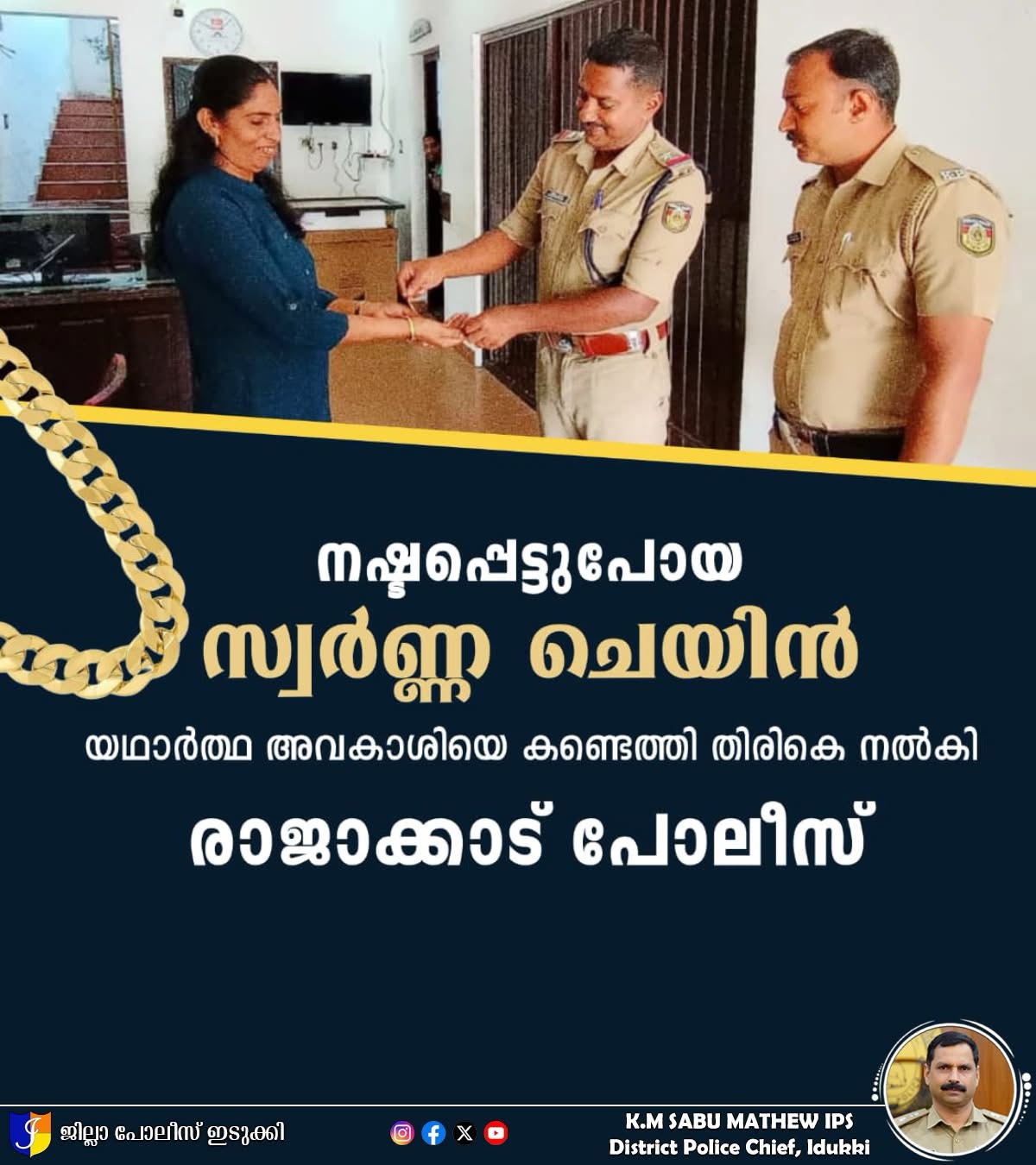 രാജകുമാരി ദേവമാത പള്ളിപെരുന്നാളിന് ഇടയിൽ ചെമ്മണ്ണാർ സ്വദേശിനി ആയ വീട്ടമ്മയുടെ സ്വർണ്ണ ചെയിൻ കളഞ്ഞു കിട്ടിയിരുന്നു. അത് യഥാർത്ഥ അവകാശിയെ തന്നെ കണ്ടെത്തി തിരികെ നൽകി രാജാക്കാട് പോലീസ്. അവകാശികൾ ആണെന്ന് പറഞ്ഞ് പലരും സ്റ്റേഷനിൽ വന്നുവെങ്കിലും കൃത്യമായ അന്വേഷണത്തിന് ഒടുവിൽ സ്വർണ്ണ ചെയിന്റെ ഉടമയായ വീട്ടമ്മയെ കണ്ടെത്തുകയായിരുന്നു. സീനിയർ സിവിൽ പോലീസ് ഓഫീസർ ബിനു പി ആർ, സിവിൽ പോലീസ് ഓഫീസർ സിജോ എന്നിവരുടെ സാന്നിധ്യത്തിൽ സബ് ഇൻസ്പെക്ടർ ബോബി എം തോമസ് സ്വർണ്ണ ചെയിൻ കൈമാറി.
