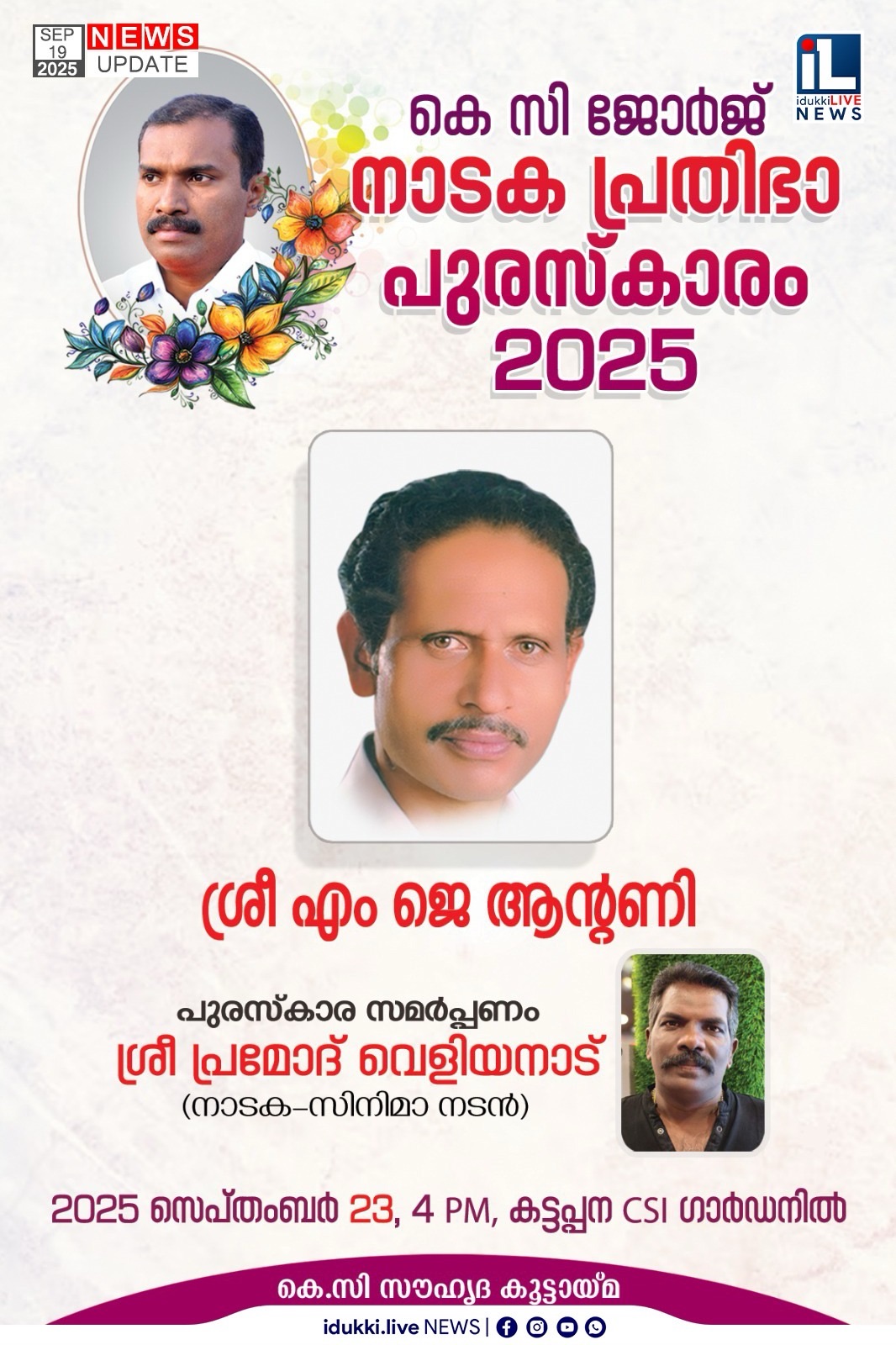 പ്രഥമ കെ സി ജോർജ് നാടക പ്രതിഭാ പുരസ്കാരം നാടക കൃത്ത് എം ജെ ആൻ്റണിക്ക്. രണ്ട് തവണ മികച്ച നാടക കൃത്തിനുള്ള സംസ്ഥാന അവാർഡ് നേടിയ കെ സി ജോർജിൻ്റെ സ്മരണക്കായി കെ സി സൗഹൃദ കൂട്ടായ്മയാണ് പുരസ്കാരം ഏർപ്പെടുത്തിയത്. കെ സിയുടെ ഒന്നാം ചരമവാർഷികത്തോടനുബന്ധിച്ച് കട്ടപ്പന സി എസ് ഐ ഗാർഡനിൽ നടത്തുന്ന അനുസ്മരണ സമ്മേളനത്തിൽ വച്ച് പ്രശസ്ത നാടക സിനിമ നടൻ പ്രമോദ് വെളിയനാട് പുരസ്കാരം സമർപ്പിക്കും.