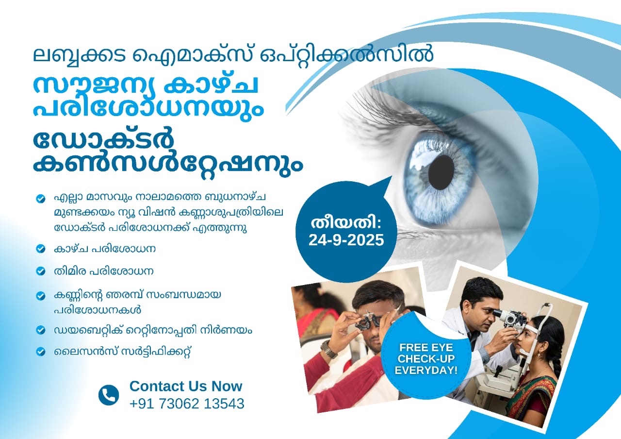 24/09/2025 ബുധനാഴ്ച്ച രാവിലെ 10 മണി മുതൽ 1 മണി വരെ ലബ്ബക്കട ഐ മാക്സ് ഓപ്ടിക്കൽസിൽ സൗജന്യ നേത്ര പരിശോധന, സൗജന്യ ഡോക്ടർ കൺസൾട്ടേഷൻ ഉണ്ടായിരിക്കുന്നതാണ്. ലൈസൻസ് സർട്ടിഫിക്കറ്റ്, തിമിര പരിശോധന, സൗജന്യ കാഴ്ച്ച പരിശോധന, ഡയബറ്റിക് റെറ്റിനോപ്പതി നിർണ്ണയം, സൗജന്യ ഡോക്ടർ കൺസൾട്ടേഷൻ എന്നീ സേവനങ്ങൾ ലഭ്യമാണ്.