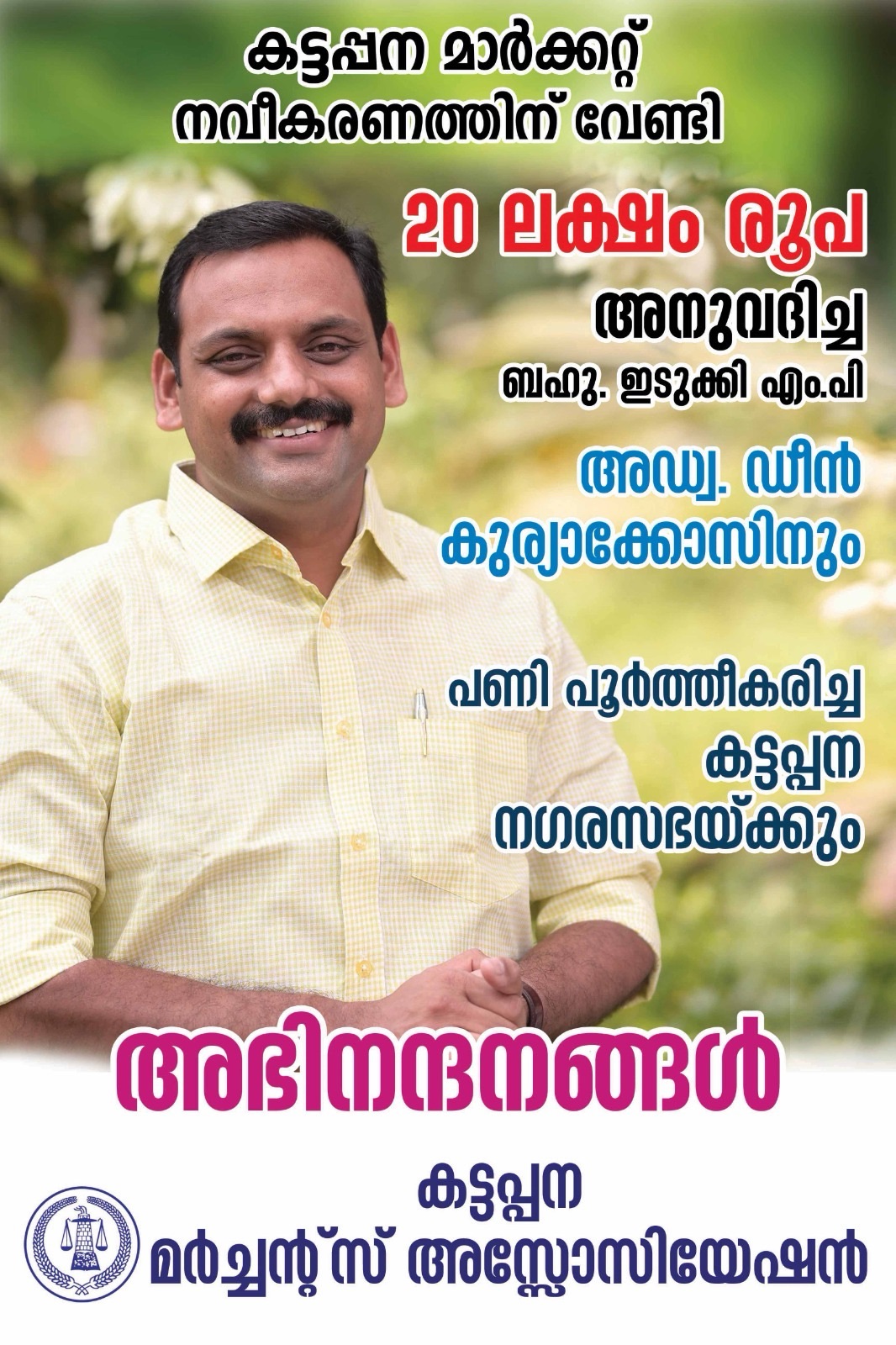 കട്ടപ്പന മാർക്കറ്റ് നവീകരണത്തിന് 20 ലക്ഷം രൂപ അനുവദിച്ച അഡ്വ. ഡീൻ കുര്യാക്കോസിന് അഭിനന്ദനങ്ങൾ അറിയിച്ച് കട്ടപ്പന മർച്ചന്റ്സ് അസോസിയേഷൻ