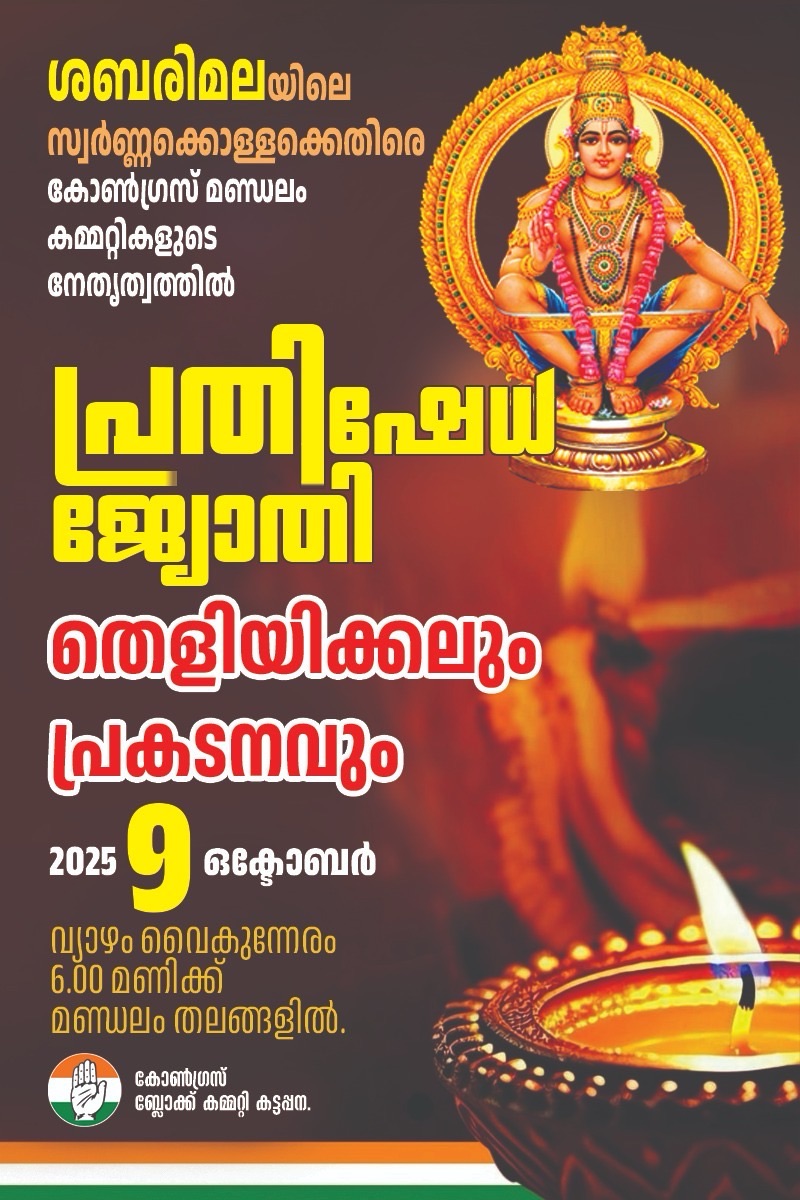 വിശ്വാസികളെ വഞ്ചിച്ച് സ്വർണ്ണക്കൊള്ള നടത്തി ശബരിമലയുടെ പവിത്രത നശിപ്പിച്ച സംസ്ഥാന സർക്കാരിനും ദേവസ്വം ബോർഡിനുമെതിരെ കെ പി സി സി യുടെ നിർദ്ദേശ സംസ്ഥാനമൊട്ടാകെ ഒക്ടോബർ ഒൻപതാം തീയതി വ്യാഴാഴ്ച കോൺഗ്രസ് മണ്ഡലം കമ്മറ്റികളുടെ നേതൃത്വത്തിൽ മണ്ഡലം തലങ്ങളിൽ പ്രതിഷേധ ജ്യോതി തെളിയിക്കലും പ്രകടനവും നടക്കും.ഇതിന്റെ ഭാഗമായി കോൺഗ്രസ് കട്ടപ്പന ബ്ലോക്ക് കമ്മറ്റിക്ക് കീഴിൽ വരുന്ന കട്ടപ്പന, കാഞ്ചിയാർ, കാമാക്ഷി, കൊന്നത്തടി, വാത്തിക്കുടി മണ്ഡലം കമ്മറ്റികളുടെ നേതൃത്വത്തിൽ അതാത് സ്ഥലങ്ങളിൽ വ്യാഴാഴ്ച വൈകുന്നേരം ആറ് മണിക്ക് പ്രതിഷേധ പരിപാടി സംഘടിപ്പിക്കുമെന്ന് കോൺഗ്രസ് കട്ടപ്പന ബ്ലോക്ക് പ്രസിഡണ്ട് തോമസ് മൈക്കിൾ അറിയിച്ചു.