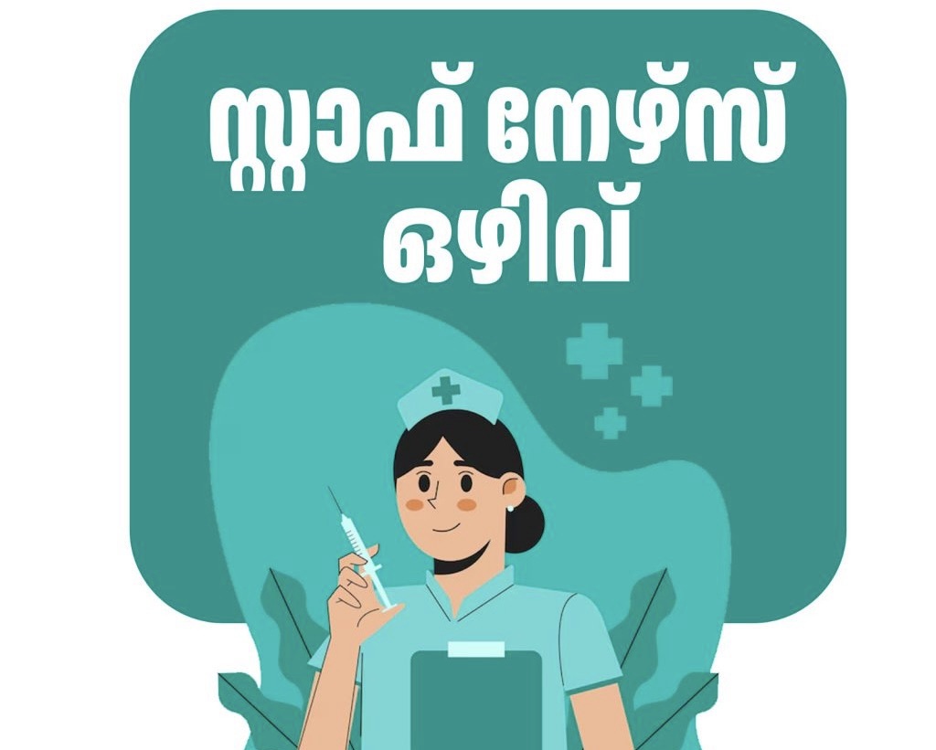 സ്റ്റാഫ് നേഴ്‌സിന് കേരള നഴ്‌സിംഗ് കൗൺസിൽ രജിസ്‌ട്രേഷനോടെ എം.എസ്‌സി സൈക്യാട്രിക് നഴ്‌സിംഗ്/ സൈക്യാട്രിക് നഴ്‌സിംഗിൽ ഡിപ്ലോമ എ/ബി.എസ്‌സി നഴ്‌സിംഗ്/ ജനറൽ നഴ്‌സിംഗ് (സൈക്യാട്രിക് നഴ്‌സിംഗ് മേഖലയിൽ പരിചയം) എന്നീ യോഗ്യതകൾ ഉണ്ടായിരിക്കണം. താൽപ്പര്യമുള്ളവർ ബയോഡാറ്റയും യോഗ്യത തെളിയിക്കുന്ന അസൽ സർട്ടിഫിക്കറ്റുകളും പകർപ്പും സഹിതം പങ്കെടുക്കണം.ഫോൺ:04862-233030