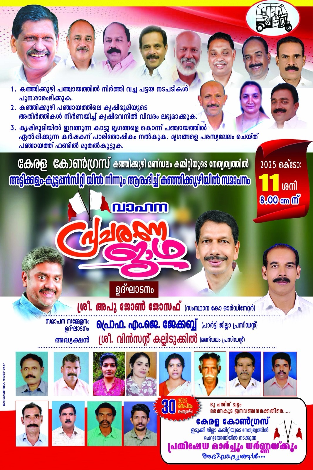 നിർമ്മാണ നിരോധനം പിൻവലിക്കുക, ഭൂപതിവ് നിയമ ഭേദഗതി ചട്ടങ്ങളിലെ കർഷക – ജനവിരുദ്ധ നിർദ്ദേശങ്ങൾ റദ്ദാക്കുക, കഞ്ഞിക്കുഴി പഞ്ചായത്തിലെ നിർത്തി വച്ച പട്ടയ നടപടികൾ പുനരാരംഭിക്കുക, പഞ്ചായത്തിലെ കൃഷി ഭൂമിയുടെ അതിർത്തികൾ നിർണയിച്ച് കൃഷിഭവനിൽ വിവരം ലഭ്യമാക്കുക, വന്യമൃഗശല്യം തടയാൻ നടപടി സ്വീകരിക്കുക , കൃഷി ഭൂമിയിൽ ഇറങ്ങുന്ന കാട്ടുമൃഗങ്ങളെ കൊന്ന് പഞ്ചായത്തിൽ ഏൽപ്പിക്കുന്ന കർഷകന് പാരിതോഷികം നൽകുക, മൃഗങ്ങളെ പരസ്യ ലേലം ചെയ്ത് പഞ്ചായത്ത് ഫണ്ടിൽ മുതൽ കൂട്ടുക, ജപ്തി നടപടികൾ നിർത്തി വച്ച് 2026 മാർച്ച് 31 വരെ പലിശരഹിത മൊറട്ടോറിയം അനുവദിക്കുക, 12000 കോടി രൂപയുടെ ഇടുക്കി പാക്കേജ് വാഗ്ദാനമായി തുടരുന്നത് അവസാനിപ്പിക്കുക തുടങ്ങിയ ആവശ്യങ്ങളുന്നയിച്ചു കൊണ്ട് കേരളാ കോൺഗ്രസ് കഞ്ഞിക്കുഴിമണ്ഡലം കമ്മറ്റി നേതൃത്വത്തിൽ 11 – ന് [ 11-10-2025 ശനി ] കർഷക സംരക്ഷണ സമര ജാഥ നടത്തുന്നു…… രാവിലെ 8.30 – ന് കരിമ്പൻ കുട്ടപ്പൻ സിറ്റിയിൽ പാർട്ടി സംസ്ഥാന കോ-ഓർഡിനേറ്റർ അപു ജോൺ ജോസഫ് ഉദ്ഘാടനം ചെയ്യും. മണ്ഡലം പ്രസിഡണ്ട് വിൻസന്റ് കല്ലിടുക്കിൽ അദ്ധ്യക്ഷത വഹിക്കും. സംസ്ഥാന ഉന്നതാധികാര സമിതിയംഗം നോബിൾ ജോസഫ് കേരള കർഷക യൂണിയൻ സംസ്ഥാന പ്രസിഡണ്ട് വർഗീസ് വെട്ടിയാങ്കൽ കേരളാ കോൺഗ്രസ് നിയോജകമണ്ഡലം പ്രസിഡണ്ട് ജോയി കൊച്ചുകരോട്ട് ജില്ലാ സെക്രട്ടറിയേറ്റംഗം പ്രദീപ് ജോർജ് യൂത്ത് ഫ്രണ്ട് ജില്ലാ പ്രസിഡണ്ട് അഡ്വ. എബി തോമസ് യു.ഡി.എഫ് മണ്ഡലം കൺവീനർ ജോസ് മോടിക്കൽ പുത്തൻപുര ഗ്രാമപഞ്ചായത്ത് സ്റ്റാൻറിംഗ് കമ്മറ്റി ചെയർപേഴ്സൺ സിൽവി സോജൻഎന്നിവർ പ്രസംഗിക്കും …………. ചുരുളി, ചേലച്ചുവട്, കീരിത്തോട്, പുന്ന യാർ നിരപ്പ്, പഴയരിക്കണ്ടം, വരിക്ക മുത്തൻ, വെൺമണി, മൈലപ്പുഴ, മഴുവടി കോളനി, ചുരുളിപ്പതാൽ , ആൽ പ്പാറ റേഷൻകട, നാലുകമ്പി, തള്ളക്കാനം, ആശുപത്രിപ്പടിഎന്നീ കേന്ദ്രങ്ങളിൽ പര്യടനം നടത്തും. ലിസി മാത്യു, സലിപീച്ചാംപാറയിൽ,മാത്യു ജോസഫ്, ജോയി പുതുപ്പറമ്പിൽ,ജോസ് എടാട്ട് , ജോഷ്വാ ദേവസ്യാ, അലക്സ് സാം, സണ്ണി എമ്പ്രയിൽ , സണ്ണി മുണ്ടയ്ക്കാട്ട് എന്നിവരും നേതാക്കളും വിവിധ സ്ഥലങ്ങളിൽ പ്രസംഗിക്കും. ………… കഞ്ഞിക്കുഴിയിൽ നടക്കുന്ന സമാപന സമ്മേളനം പാർട്ടി ജില്ലാ പ്രസിഡണ്ട് പ്രൊഫ.എം.ജെ.ജേക്കബ് ഉദ്ഘാടനം ചെയ്യും. മണ്ഡലം പ്രസിഡണ്ട് വിൻസന്റ് കല്ലിടുക്കിൽ അധ്യക്ഷത വഹിക്കും. സംസ്ഥാന ഉന്നതാധികാര സമിതിയംഗം അഡ്വ.തോമസ് പെരുമന സംസ്ഥാന സെക്രട്ടറി വി.എ. ഉലഹന്നൻ കെ.റ്റി.യു.സി ജില്ലാ പ്രസിഡണ്ട് വർഗീസ് സക്കറിയ ജില്ലാ പഞ്ചായത്ത് മെമ്പർ ഷൈനി റെജി തുടങ്ങിയവർ പ്രസംഗിക്കും..