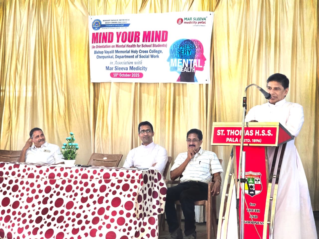 ബിഷപ്പ് വയലിൽ മെമ്മോറിയൽ ഹോളി ക്രോസ് കോളേജ്, സോഷ്യൽ വർക്ക് വിഭാഗത്തിന്റെ ആഭിമുഖ്യത്തിൽ ലോകമാനസികാരോഗ്യ ദിനത്തോട് അനുബന്ധിച്ചു “മൈൻഡ് യുവർ മൈൻഡ് – മാനസികാരോഗ്യ ബോധവത്കരണ പരിപാടി” പാലാ രൂപതയുടെ കീഴിലുള്ള എല്ലാ ഹയർ സെക്കന്ററി സ്കൂളുകളിലും സംഘടിപ്പിച്ചു. മാർ ശ്ലീവാ മെഡിസിറ്റിയിലെ സൈക്കോളജി വിഭാഗം കോളേജിലെ വിദ്യാർത്ഥികൾക്ക് പരിശീലനം നൽകി.