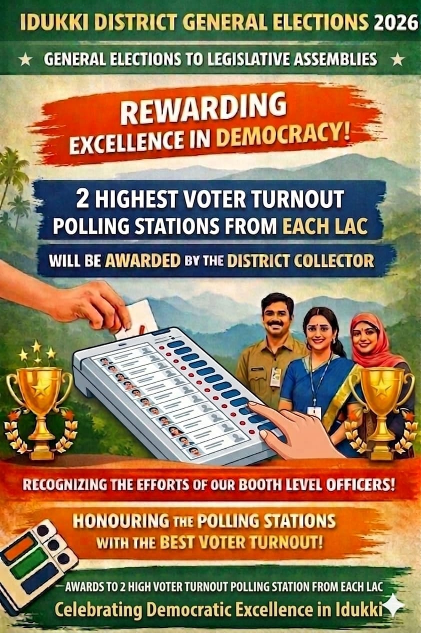 സംസ്ഥാന നിയമസഭാ തെരഞ്ഞെടുപ്പിന്റെ ഭാഗമായി ജില്ലയിൽ വോട്ടിംഗ് പങ്കാളിത്തം പ്രോത്സാഹിപ്പിക്കുന്നതിനും പോളിംഗ് ശതമാനം ഉയർത്തുന്നതിനും ഇടുക്കി ജില്ലാ ഭരണകൂടം പ്രത്യേക പരിപാടിക്ക് രൂപം നൽകി. ഓരോ നിയമസഭാ മണ്ഡലത്തിൽ നിന്നും ഏറ്റവും ഉയർന്ന വോട്ടിംഗ് ശതമാനം രേഖപ്പെടുത്തുന്ന രണ്ട് പോളിംഗ് സ്റ്റേഷനുകളെ ജില്ലാ ഭരണകൂടം ഔദ്യോഗികമായി പരസ്കാരങ്ങൾ നൽകി ആദരിക്കും. തിരഞ്ഞെടുപ്പ് പ്രക്രിയയിൽ എല്ലാവരെയും വോട്ട് ചെയ്യാൻ പ്രേരിപ്പിക്കുന്നതിനായി താഴെത്തട്ടിൽ പരിശ്രമിക്കുന്ന ബൂത്ത് ലെവൽ ഓഫീസർമാരുടെ (ബി.എൽ.ഒ) മികച്ച സേവനത്തിനുള്ള അംഗീകാരം കൂടിയാണ് പുരസ്കാരം. പൊതുജനങ്ങൾക്ക് വോട്ട് അവകാശത്തിൻ്റെ പ്രാധാന്യം മനസിലാക്കാനും, വോട്ട് ഉറപ്പാക്കുന്നതിനും സ്വീപ് അടക്കമുള്ള വിവിധ വോട്ടിംഗ് ബോധവത്കരണ പ്രവർത്തനങ്ങളും ഭരണകൂടം ജില്ലയിൽ നടത്തുന്നുണ്ട്.